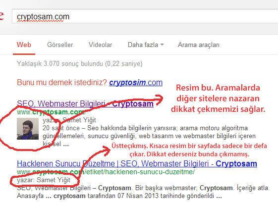 Site Yazarı Google +: <a href="https://plus.google.com/100119547146062486975?rel=author">Samet Yiğit</a>3 adımı uyguladığınızda birkaç gün içinde aramalarda resim çıkmaya başlayacaktır. Zengin Snipper test aracı ile hata yapıp yapmadığınızı benim sitenle karşılaştırır kontrol edersiniz. Test için adres şurası: http://goo.gl/7Zdiu